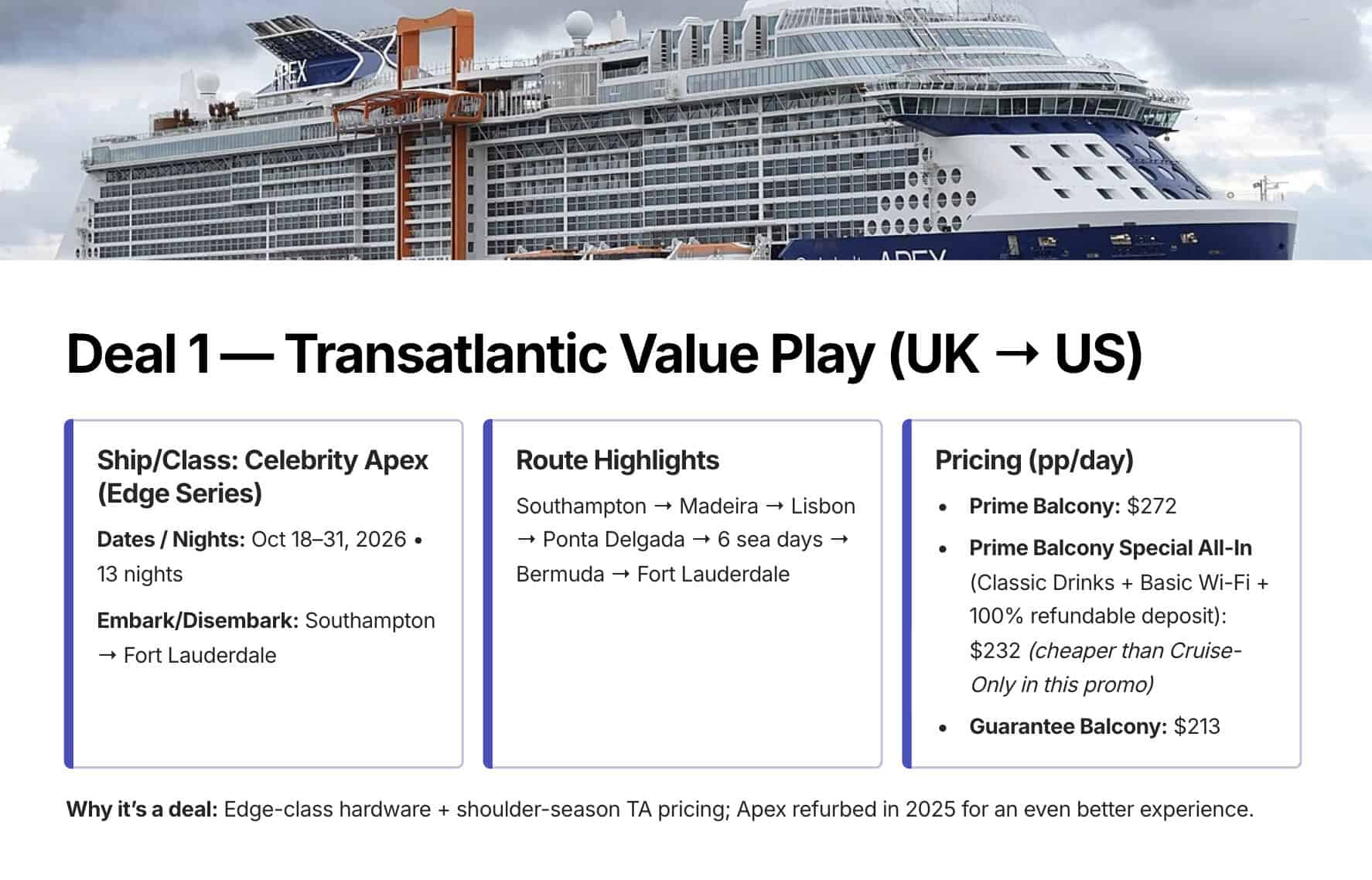 1. Celebrity Apex — Transatlantic Repositioning (Southampton → Fort Lauderdale, Fall 2026)