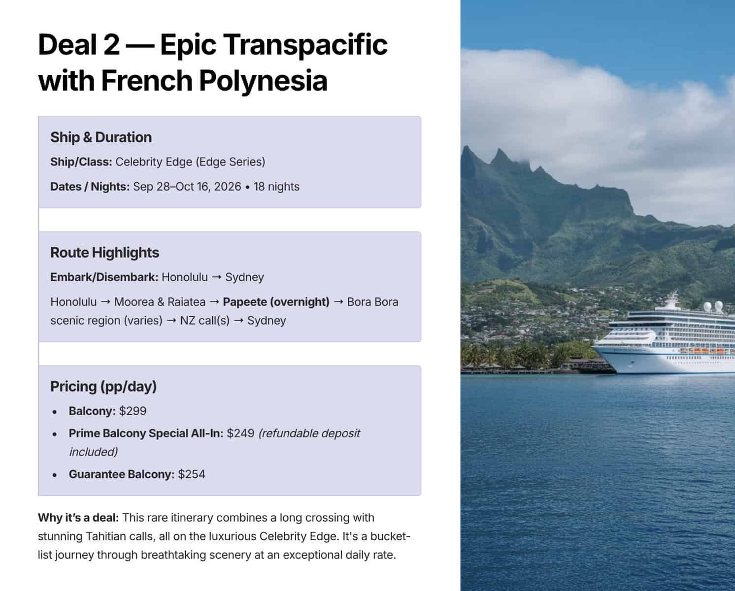 2. Celebrity Edge — Honolulu to Sydney (18 nights, 2026) — French Polynesia & South Pacific