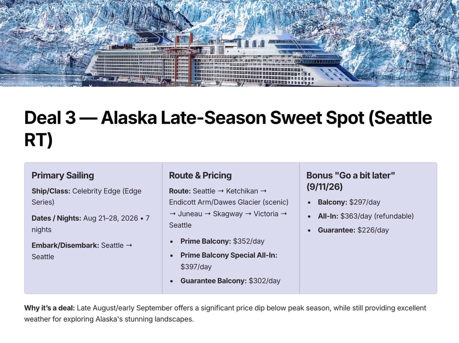 Why it’s great: Edge class comfort for Alaska itineraries, with late‑season departures that mean fewer crowds and often better pricing.