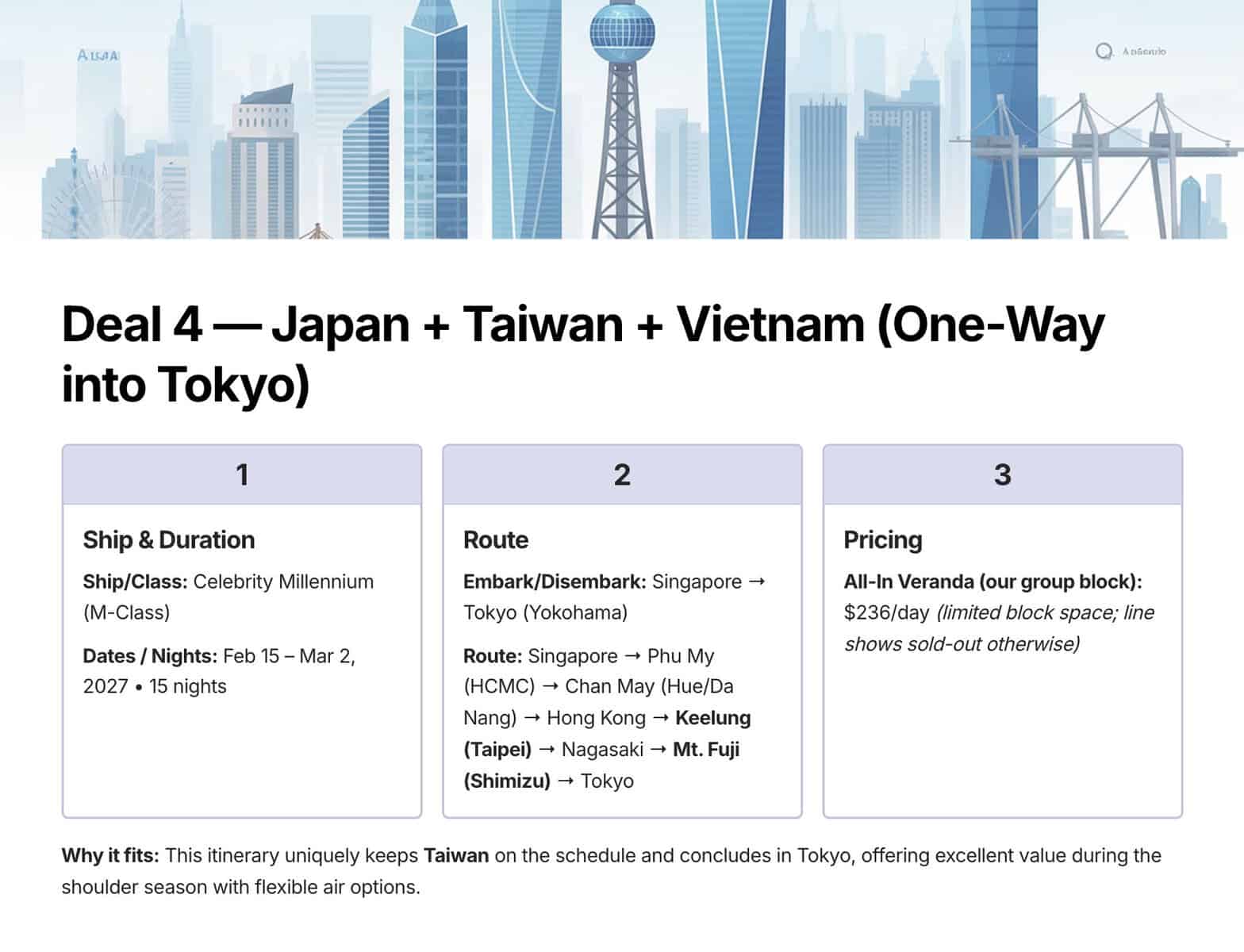 Why it’s great: A lengthy Asia one‑way that hits Taiwan, Vietnam, and Hong Kong en route to Japan. Excellent value for Asia itineraries.