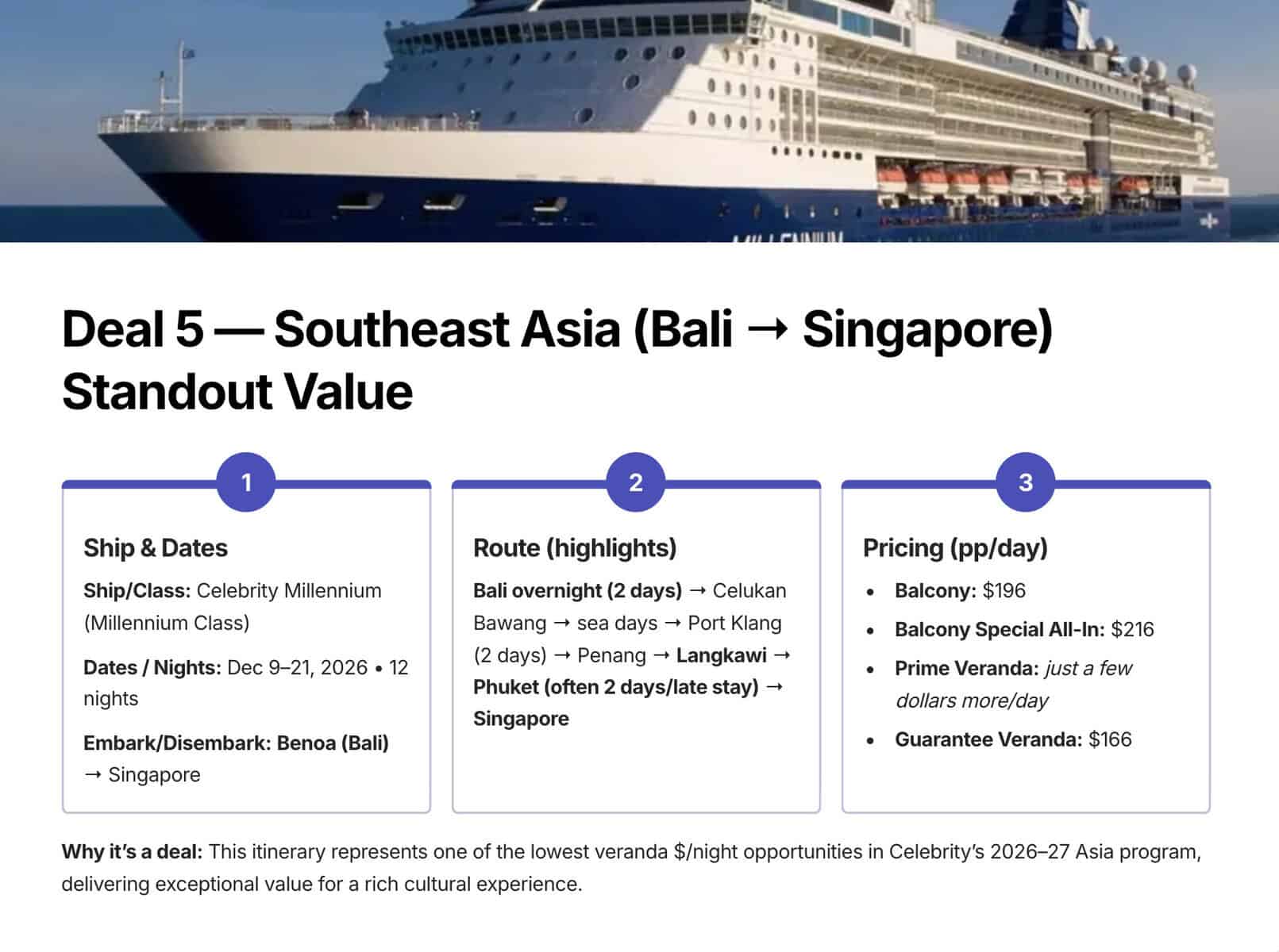 Tip: Stack discounts. Where applicable, combine resident, senior, or promotion codes plus advisor perks to maximize onboard credit and savings. Not all promos combine, so check first.5. Celebrity Millennium — Bali to Singapore (Asia loop)