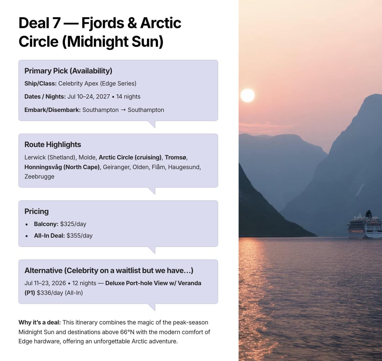 Tip: If you own 100 shares of Royal Caribbean Group you may be eligible for onboard credit across Royal, Celebrity, and Silversea. Also watch for status matches and the ability to apply loyalty credits across brands for faster elite upgrades.7. Celebrity Apex — Fjords and Arctic Circle, Midnight Sun (Summer 2027)