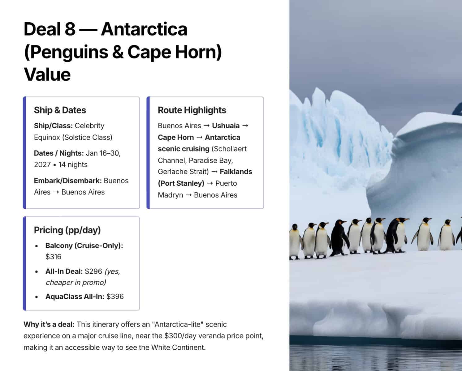 Tip: Book edges of peak season. A few days before or after the busiest weeks often yields better weather, fewer crowds, and lower prices.8. Celebrity Equinox — Antarctica Loop (14 nights, Buenos Aires roundtrip, 2027)