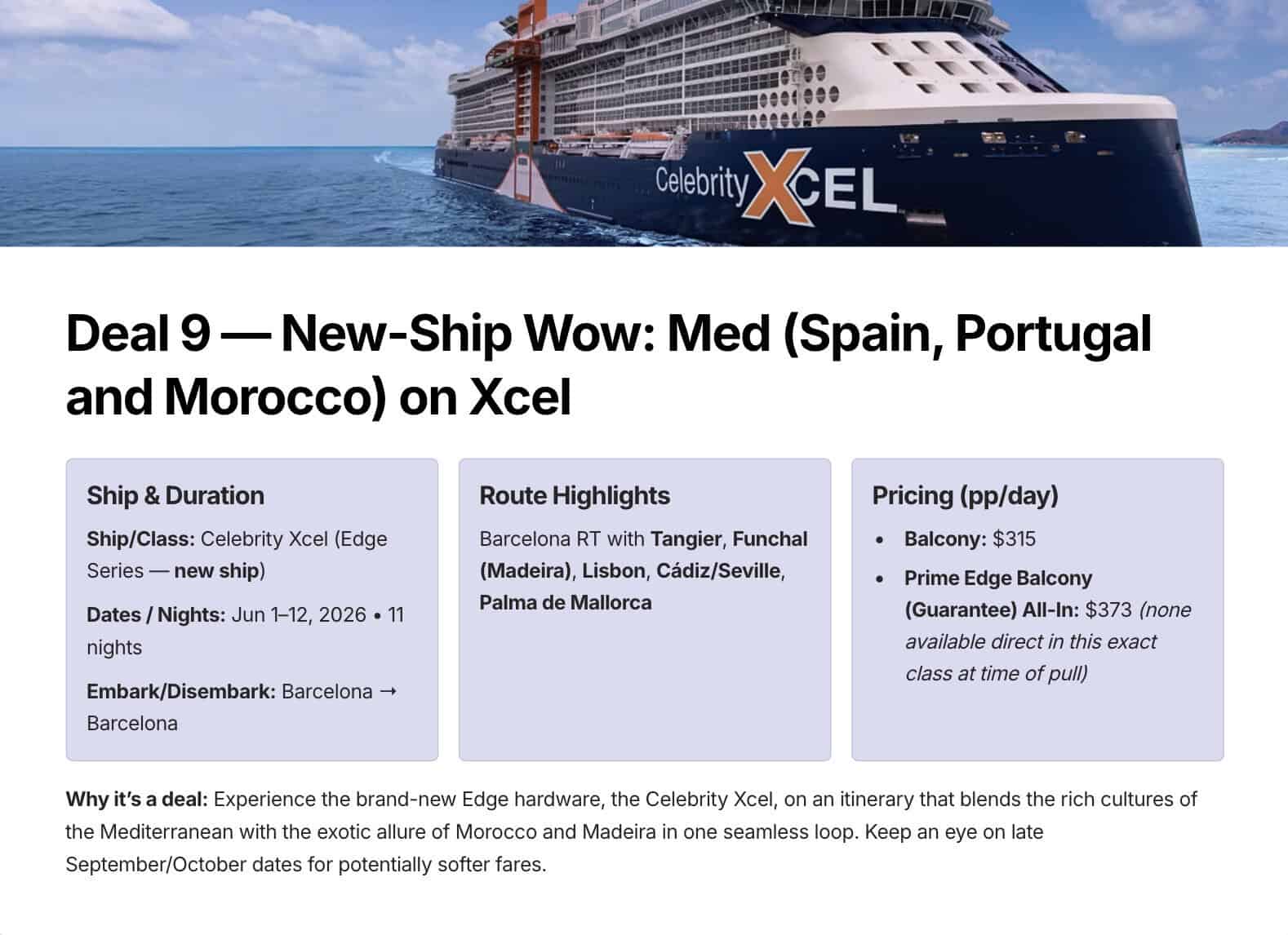 Tip: Buy extras like specialty dining, drink packages, and Wi‑Fi in advance. If Celebrity later runs a sale on those packages, cancel and rebuy at the lower price. Packages are always pricier on board.9. Celebrity XL (Edge‑class XL) — Mediterranean Loop from Barcelona (11 nights, 2026)