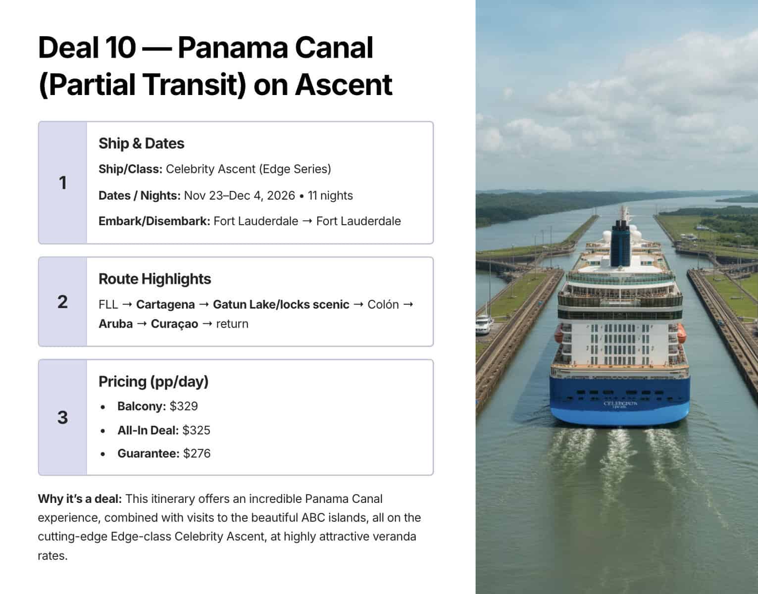 10. Celebrity Ascent — Panama Canal Partial Transit (Fort Lauderdale roundtrip, 11 nights)