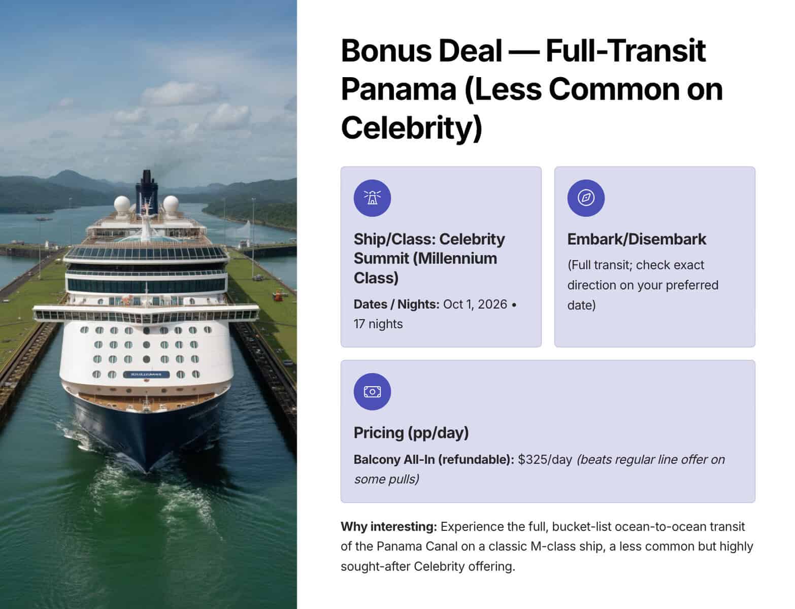 Celebrity Summit (17 nights, October 2026) — Full transit from coast to coast with classic Millennium‑class charm. All In balcony pricing around $325 per person per day. These full transits are rare and worth grabbing when they appear.