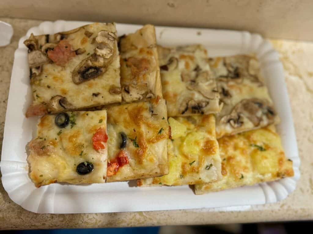 Medium crust pizza cut in rectangles generally served as a casual, takeaway snack. - Pecorino Romano