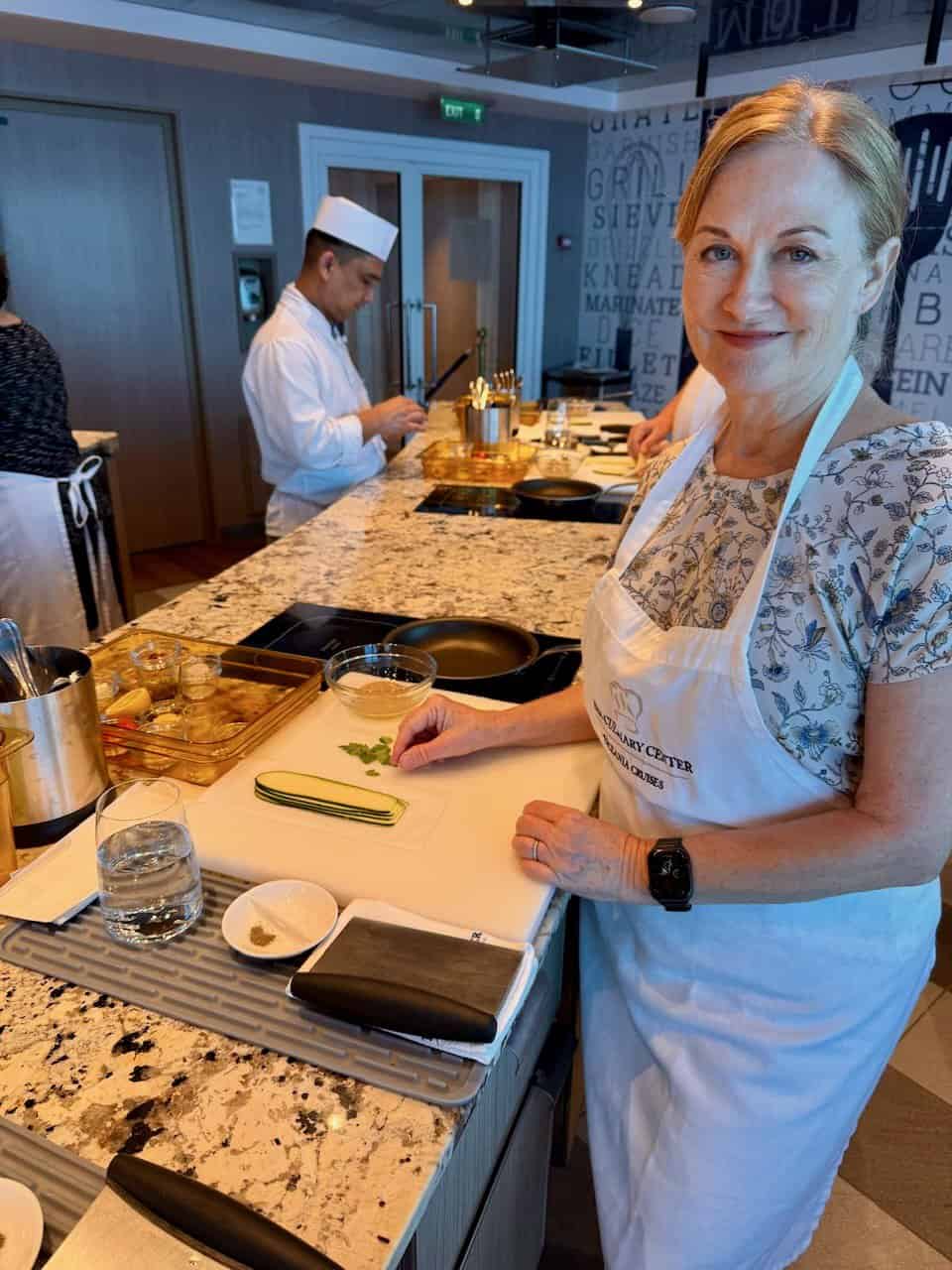 We did a plant-based cooking class onboard at The Culinary Center. On the menu: Zucchini with Walnut Paste; Socca (a bread made of chickpeas from Nice, France) with salad; a pasta with capers, garlic, and grilled cauliflower; and chia seed pudding. It was all super good – and paired with wine.