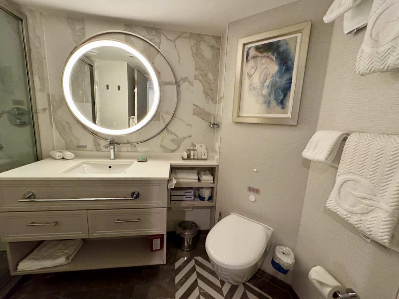 We stayed in a veranda cabin, which provided stunning views and a private balcony. The design felt modern and fresh, making our stay even more enjoyable. Storage space was ample, especially in the bathroom, which featured a walk-in shower and high-end amenities.