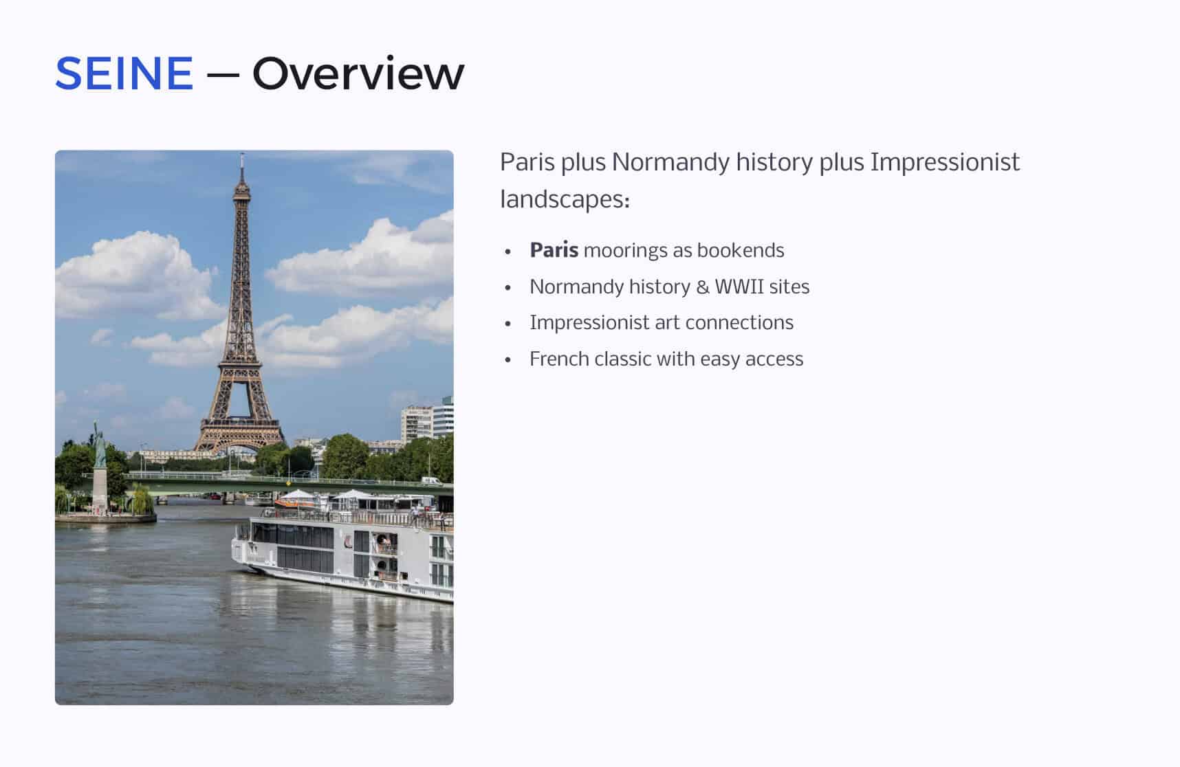 - Art, WWII history, Paris access: Seine (Paris → Normandy)