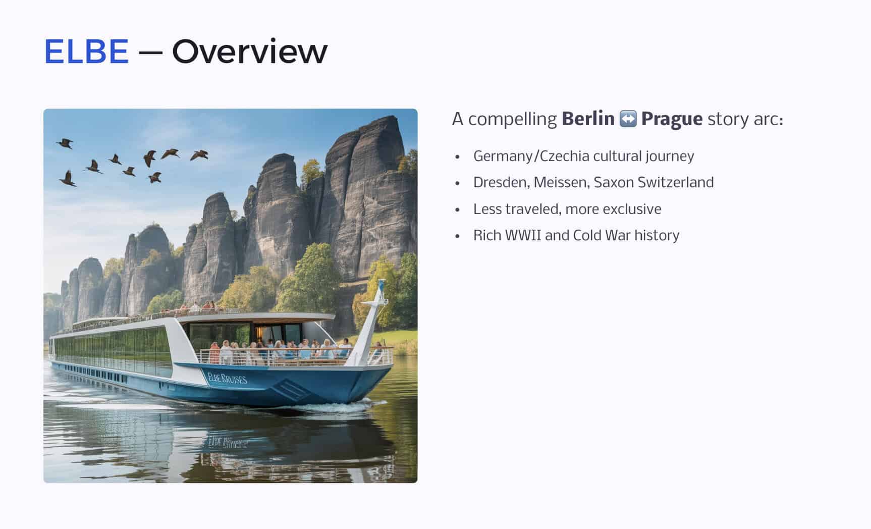 - History/unique cities: Elbe (Berlin ↔ Prague)