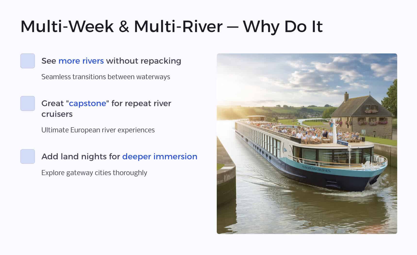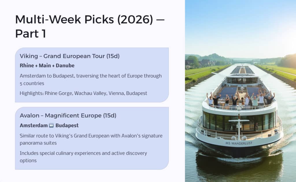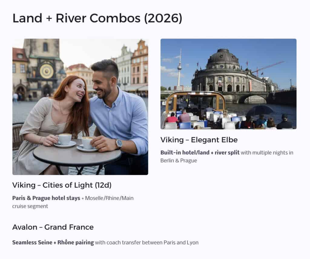 Many river lines—Viking, AmaWaterways, Avalon, Uniworld, Tauck—offer these extended combinations with curated themes (wine lovers, beer lovers, active & discovery, etc.).