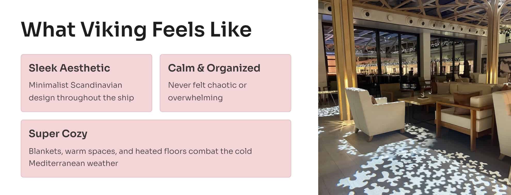 Viking leans into a calm, minimalist Scandinavian aesthetic. Expect cozy public spaces with blankets, warm corners, and a quiet, organized vibe. It never felt crowded.